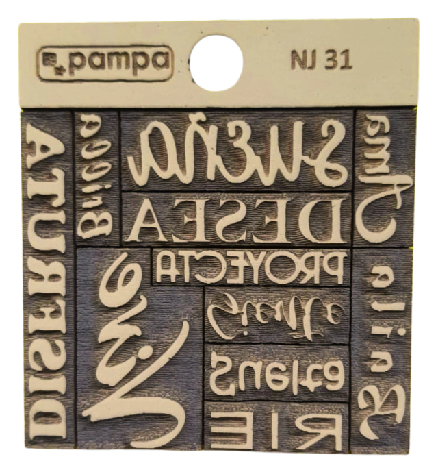 El sello decorativo collage palabras es un diseño tipográfico que combina diferentes palabras y fragmentos de texto formando una composición visual similar a un collage. Este estilo recuerda a recortes de libros, periódicos o frases superpuestas, muy utilizado en proyectos creativos, scrapbooking y papelería artística.