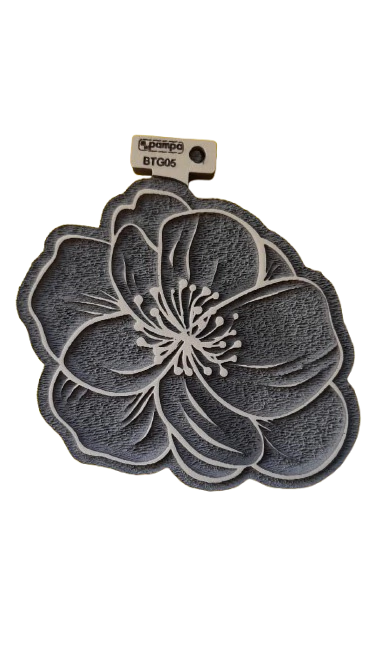 Fabricado en goma de alta densidad, este sello de goma permite obtener impresiones claras y definidas sobre papel, cartón y otras superficies porosas. El relieve reproduce con precisión los pétalos superpuestos característicos de la camelia, logrando estampados decorativos con gran detalle.
