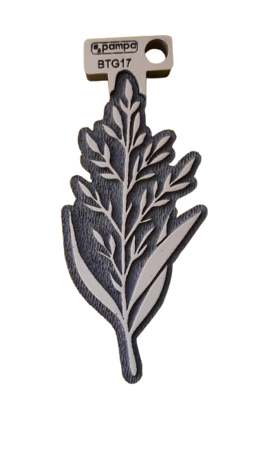 Fabricado en goma de alta densidad, este sello permite obtener impresiones claras y definidas sobre papel, cartón y otras superficies porosas. El relieve reproduce con precisión los contornos y detalles de las hojas, logrando estampados decorativos con gran nitidez.