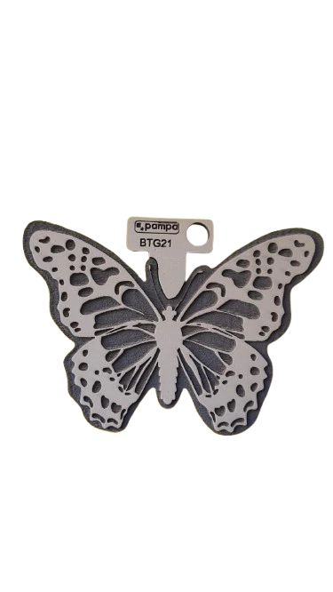 Fabricado en goma de alta densidad, este sello permite obtener impresiones claras y definidas sobre papel, cartón y otras superficies porosas. El relieve reproduce con precisión las alas de la mariposa y sus detalles ornamentales, logrando estampados decorativos con gran nitidez.