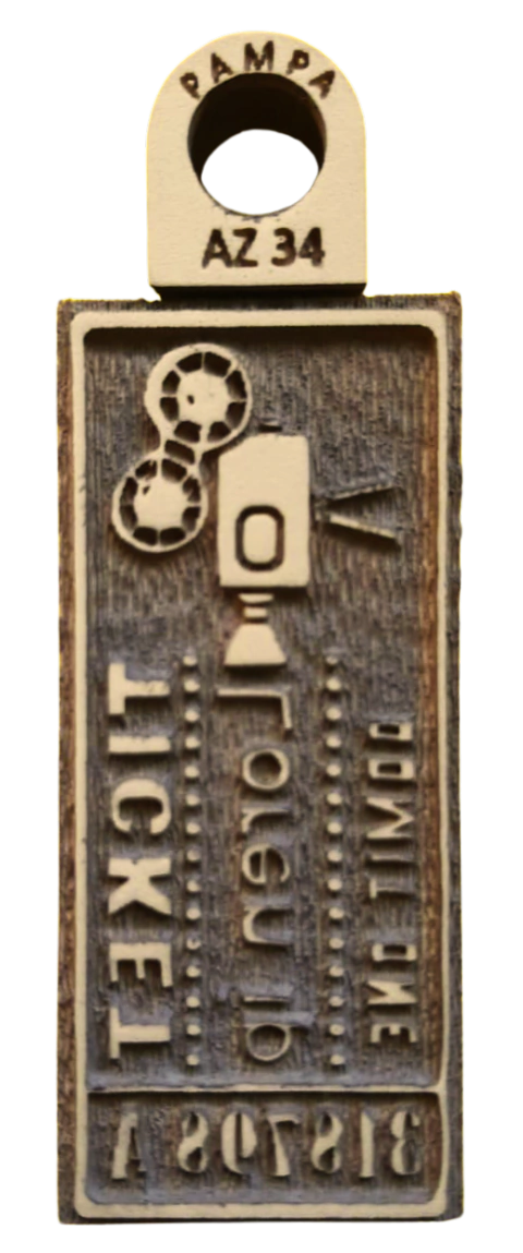 Este sello decorativo recrea la estética de los tickets de cine vintage, muy utilizados en proyectos de scrapbooking y journaling con temática retro.